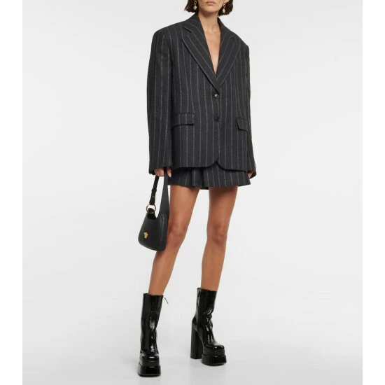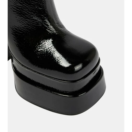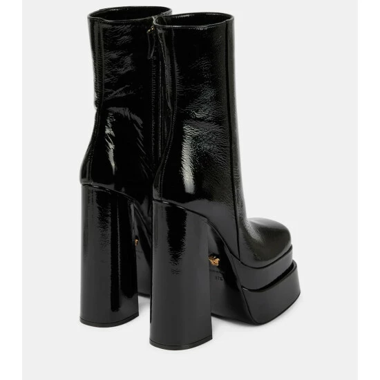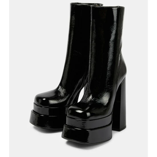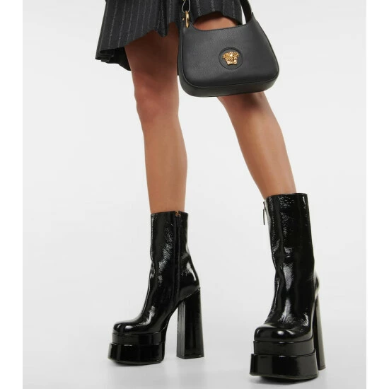 Versace’s Aevitas ankle boots are a silhouette to be seen in this season. They’re made in Italy from shiny black leather with two-tiered platforms and inner-side zippers.