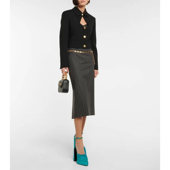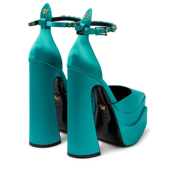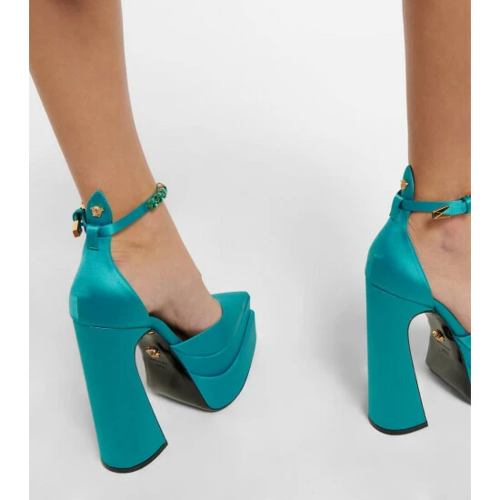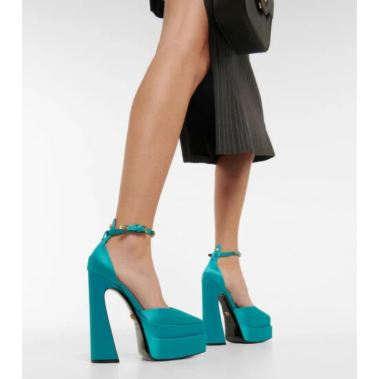 Designed to make a statement, Versace’s Aevitas Pointy pumps are made from lustrous satin and feature glamourous crystal-embellished ankle straps. They’re set on double platforms and vertiginous block heels.