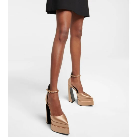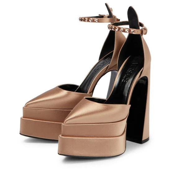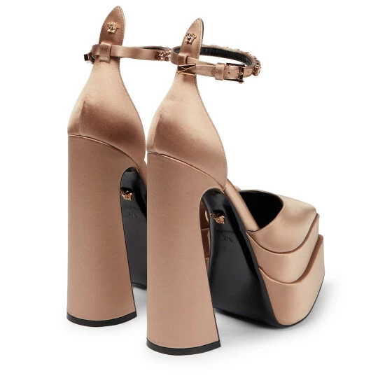 Reach soaring new heights in the Aevitas Pointy platform pumps by Versace. Appearing in lustrous satin, this double-platform style has embellished ankle straps, V-shaped buckles, and La Medusa head detailing to the high block heels.
