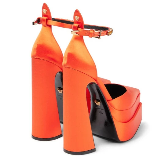 Designed to make a statement, Versace’s Aevitas Pointy pumps are made from lustrous satin and feature glamourous crystal-embellished ankle straps. The orange style is set on double platforms and vertiginous block heels.