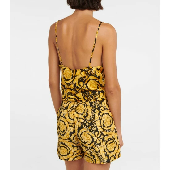 These boxer-style swim shorts are printed with Versace’s signature Barocco pattern. Mix and match them with the house’s bikini tops.