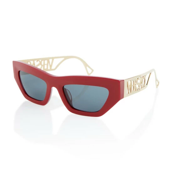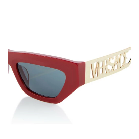 Punctuate your style point of view with these cat-eye sunglasses from Versace. With logo hardware temples, the thick acetate frames are made in Italy and house tinted lenses.