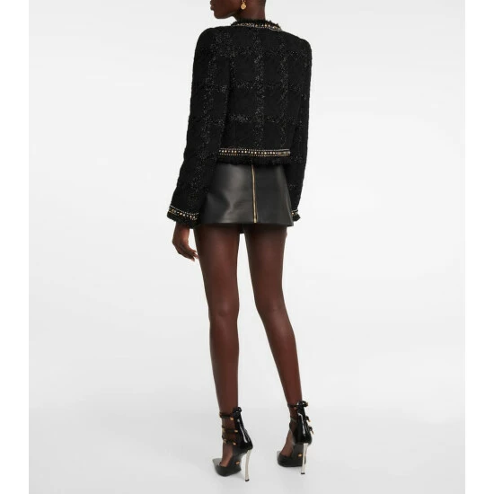 Arrive at your next occasion in this embellished jacket from Versace. Made from a wool blend to a tweed design, it features a boxy silhouette and is trimmed with spikes and rivets, creating edgy appeal.
