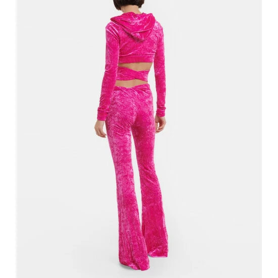 These textured velvet pants from Versace give a modern twist to a nostalgic style. This flared silhouette has an asymmetrical waist featuring a padded, rolled detail accented by a Greca pin.