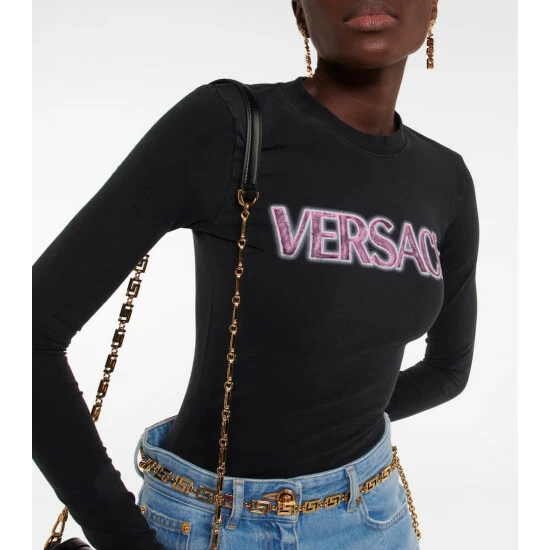 Add the vibrant T-shirt by Versace to your fun casual edit. This fitted jersey piece features the Versace Goddess logo with a spray paint effect to achieve a soft grunge look.