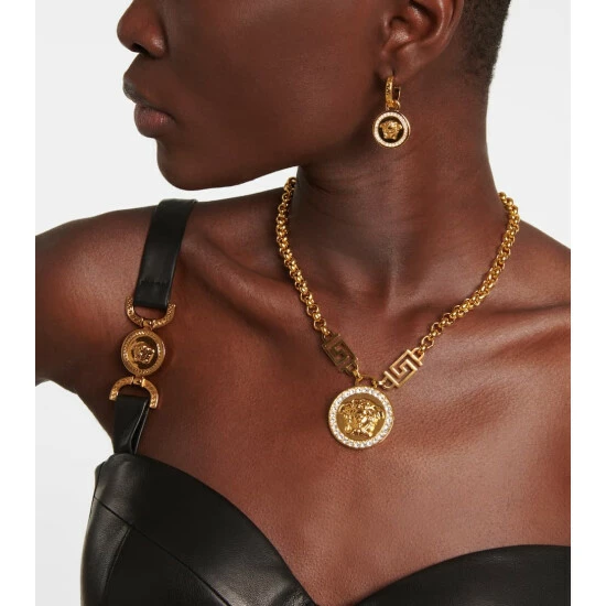 The Versace woman is known for her more-is-more aesthetic, opting for a statement look with opulent character. These drop earrings come in glossy gold tone and are enhanced by a border of dazzling crystals. The label’s signature Medusa head and Greca pattern add instant brand recognition – sweep back your hair to show them off.
