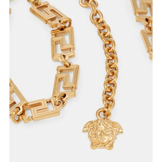 Versace’s Greca Goddess belt is defined by the Greca links that form the chain design. The gold-toned brass style has a lobster clasp and is finished with a Medusa charm.