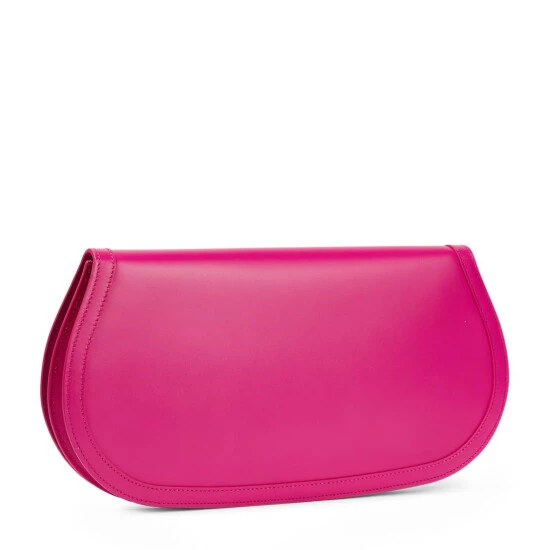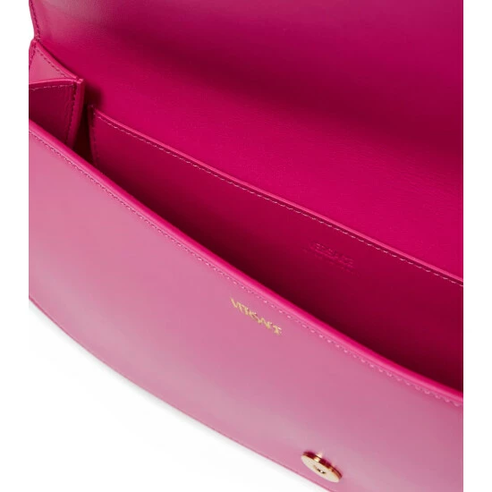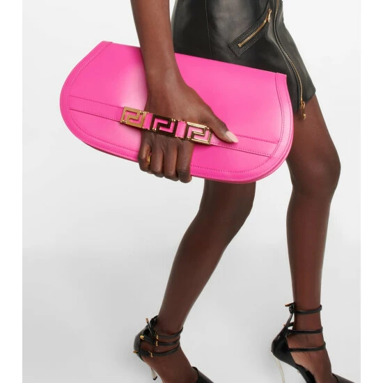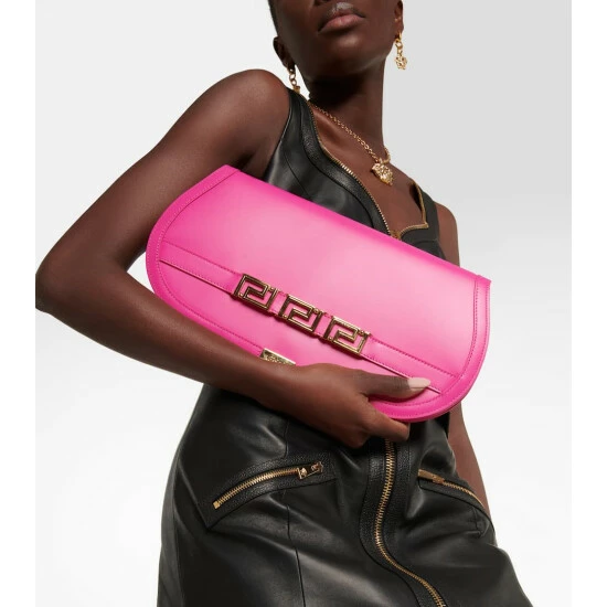 The newest addition to Versace’s Greca Goddess family, this long pouch is crafted in Italy from smooth pink leather and shaped into a long, elegantly curved silhouette with a Greca chain adorning the wrist strap.