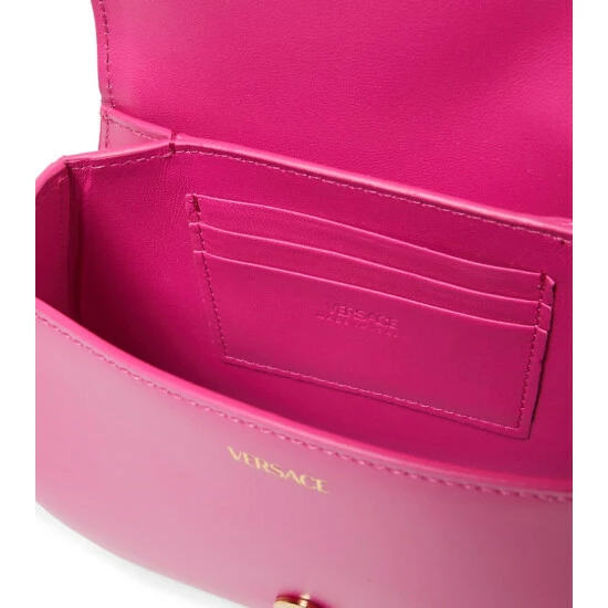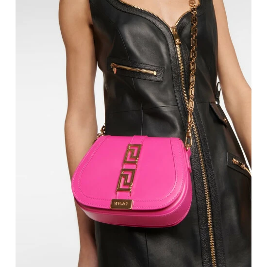 This small shoulder bag is the latest addition to Versace’s Greca Goddess line. Made from pink calf leather, the compact design has a detachable chain strap and is named for its gold-toned Greca hardware.