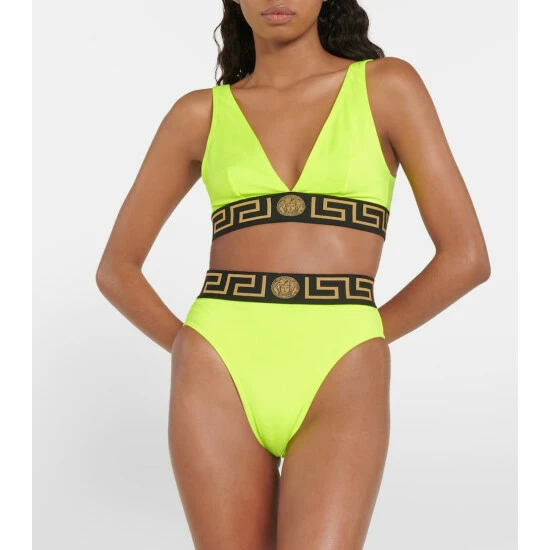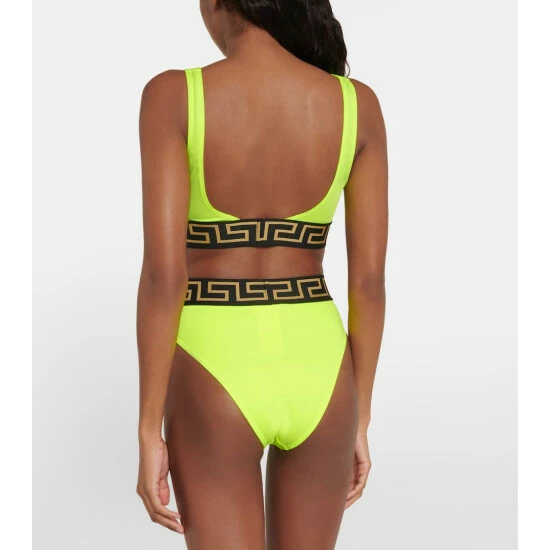 Featuring the label’s Greca motif on the elasticated waistband, this bikini top from Versace is made from a technical swim fabric and comes in a high-waisted silhouette. Style with the matching bikini top.