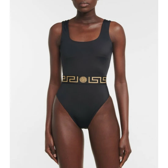 This one-piece black swimsuit is printed with Versace’s signature Medusa head motif and Greca belt detail. It’s made from stretch-swim fabric with a rounded neckline and supportive shoulder straps.
