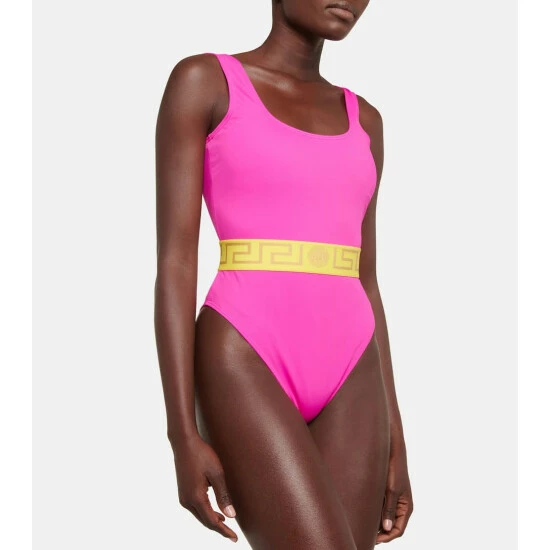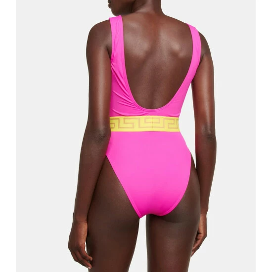 This one-piece swimsuit is printed with Versace’s signature Medusa head motif and Greca belt detail. Designed with a scoop neckline and high-cut legs, this style offers minimal coverage.