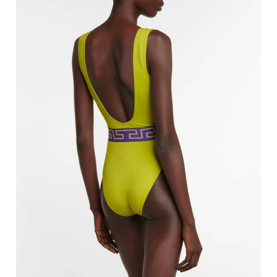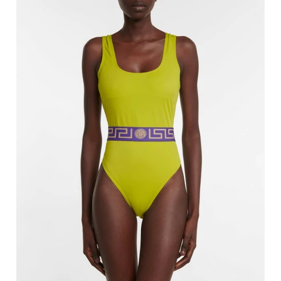 This one-piece swimsuit is printed with Versace’s signature Medusa head motif and Greca belt detail. Designed with a scoop neckline and high-cut legs, this style offers minimal coverage.