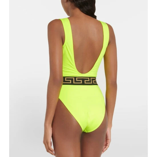 This one-piece swimsuit is printed with Versace’s signature Medusa head motif and Greca belt detail. The design is made from a technical swim fabric with a rounded neckline and supportive shoulder straps.