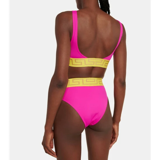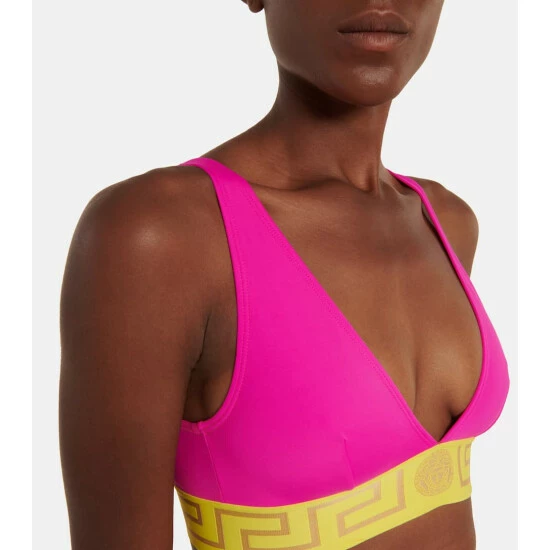Featuring the label’s Greca motif on the underband, this bikini top from Versace is made from a stretchy swim fabric and has a triangle silhouette. Style with the matching bikini bottoms.