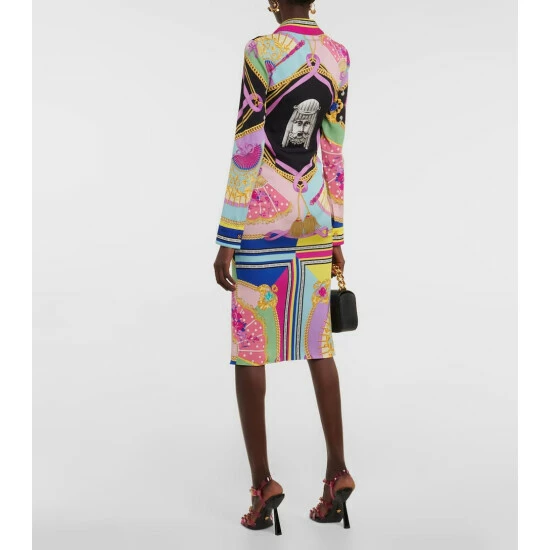 This Versace shirt dress is printed all-over with a vibrant I Ventagli pattern, showcasing iconic fans and interwoven chains. Made from a silk blend, it has a figure-hugging silhouette and a ruched zipped front.