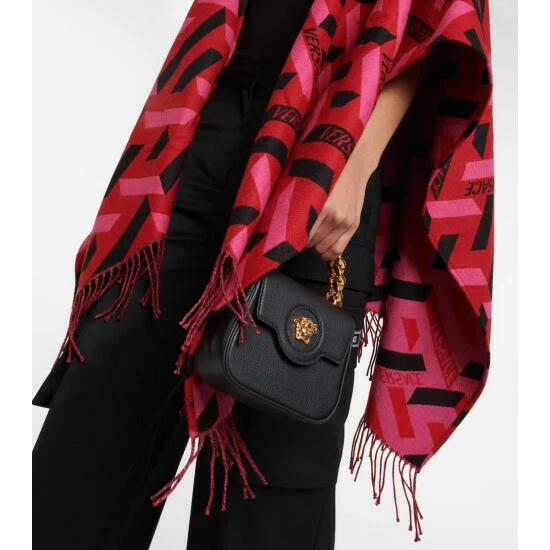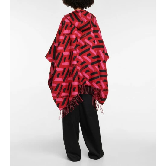 Made from double-faced wool with an all-over jacquard La Greca print, this hooded poncho from Versace is a luxurious piece for your transitional edit. A fringe-trimmed hem and a logo patch complete the design.