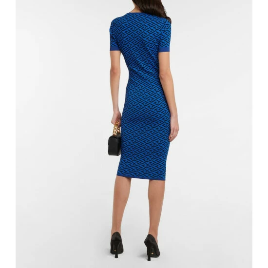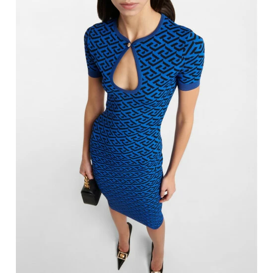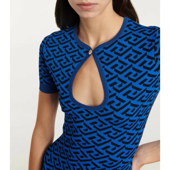 This figure-hugging dress from Versace is knitted from blue and black yarns with an all-over La Greca motif. The midi style has short sleeves and a large keyhole with a golden Medusa button.