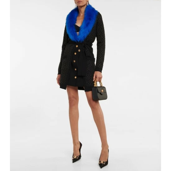 This glamorous cardigan from Versace is crafted from a blend of wool to a belted silhouette that is trimmed with a detachable shearling collar.