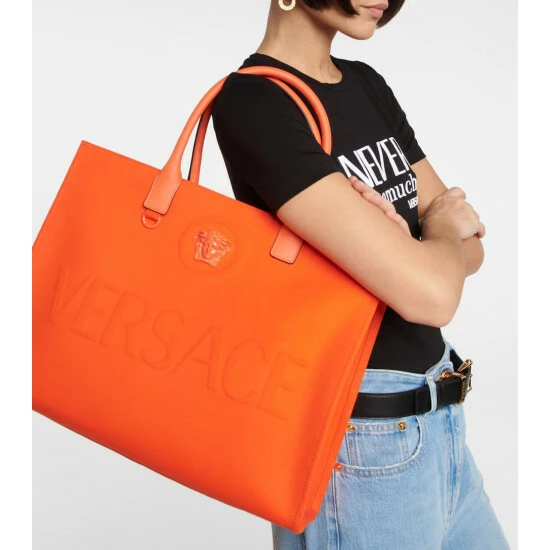 Inspired by Greek mythology, the Medusa head has become the ultimate signifier of the house of Versace. Appearing here on this cotton canvas tote bag, it’s complemented by raised logo lettering and leather top handles.