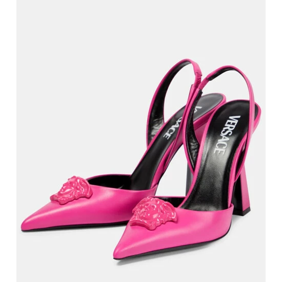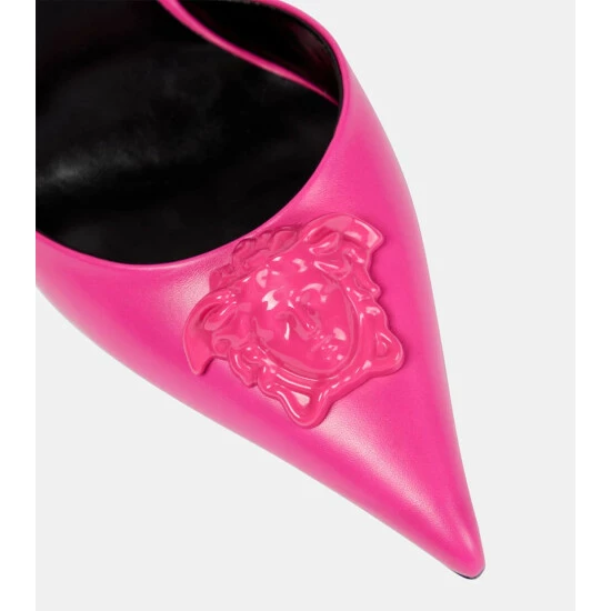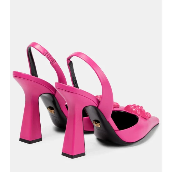 Versace’s La Medusa pumps feature slingback straps and flared heels. Made from smooth leather, this pointed-toe pair is adorned with tonal logo plaques.