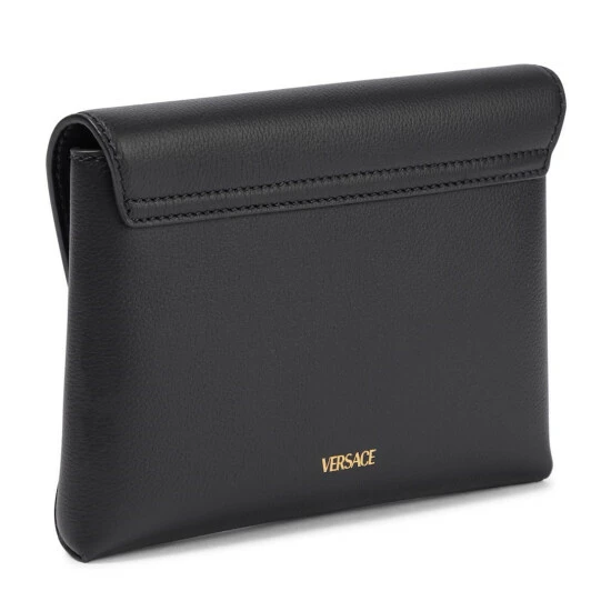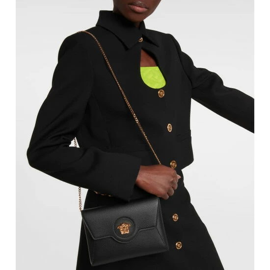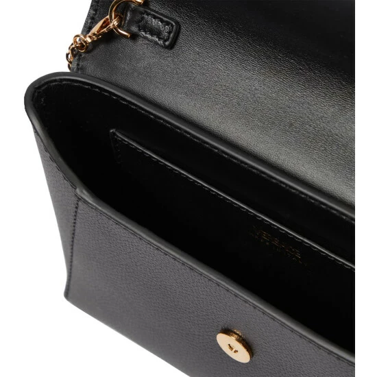 This wallet on chain from Versace will be the glamorous accent to your evening separates. Made from grained black leather, the slim clutch has a golden chain-link strap and bears the label’s long-iconic Medusa motif.