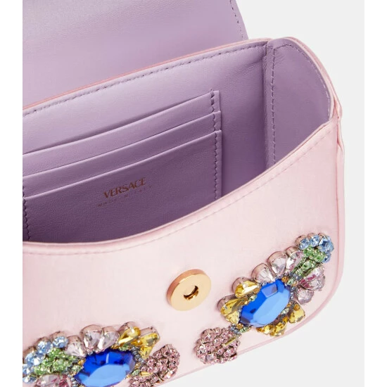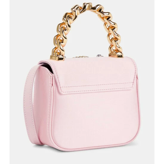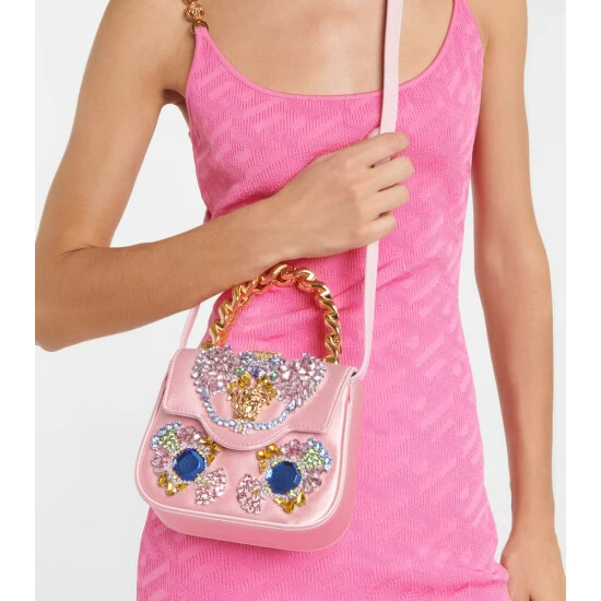 This iteration of Versace’s La Medusa Mini bag is defined by its colorful crystal embellishments. Further adorned with Medusa hardware, the compact pink design has a golden chain handle and removable shoulder strap for versatile styling.