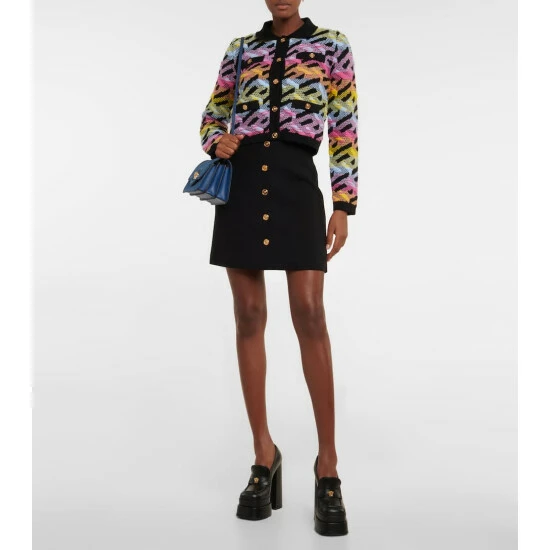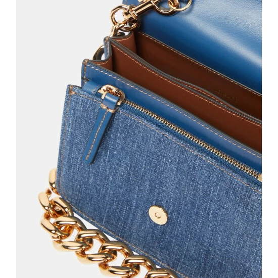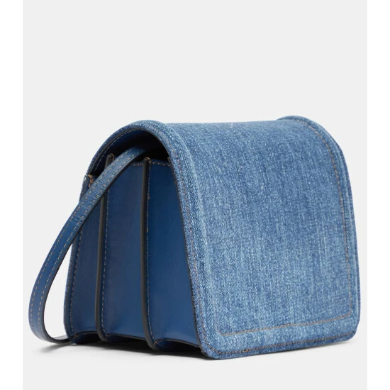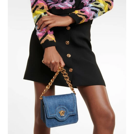 Versace’s La Medusa Small shoulder bag reworks a brand signature in a compact style and new fabrication. Made from medium wash denim, it has an accordion silhouette, Medusa hardware, and a chainlink strap.
