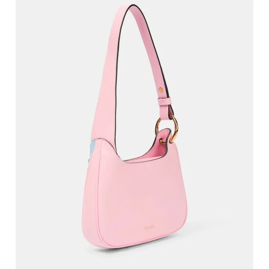 Versace’s La Medusa Small shoulder bag is crafted from pink leather with light blue panels and whip stitching, and features a gold-toned Medusa plaque – reminiscent of the ornaments found on the doors of the house’s first headquarters.