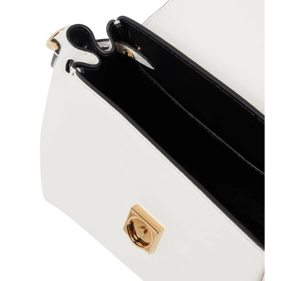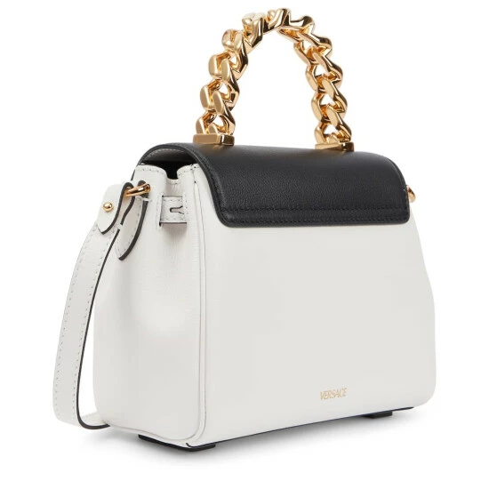 The La Medusa Small tote from Versace speaks to the house’s quintessential glamour. Made from black and white leather with a chunky curb-chain strap, the fold-over opening is stamped with a golden Medusa head.