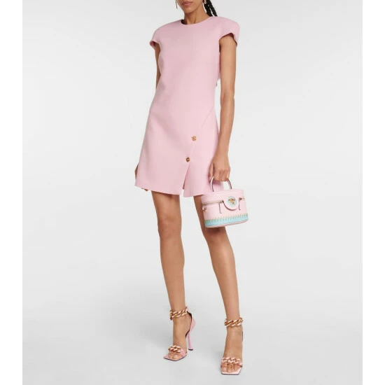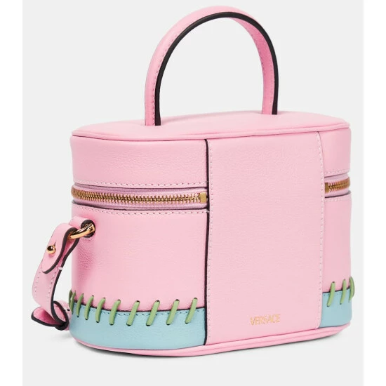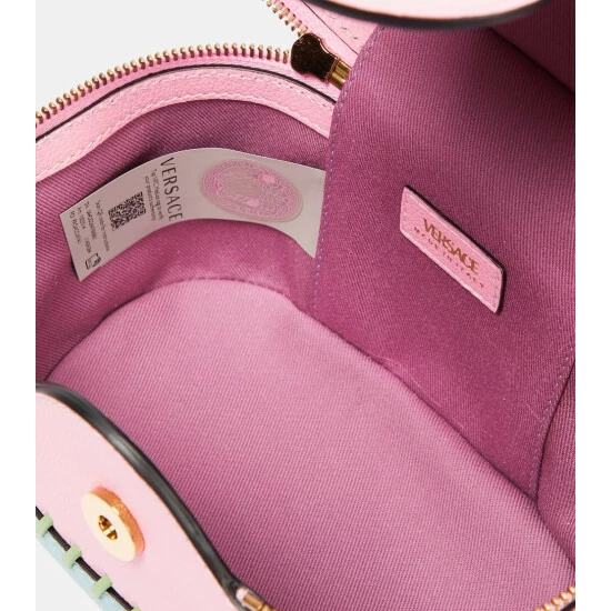 This Versace tote is inspired by a vanity case with a structured, cylindrical shape. Made in Italy from colorful, grained leather, it’s finished with a La Medusa plaque, contrast stitching, and removable shoulder strap.
