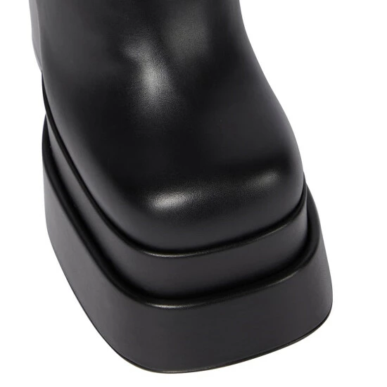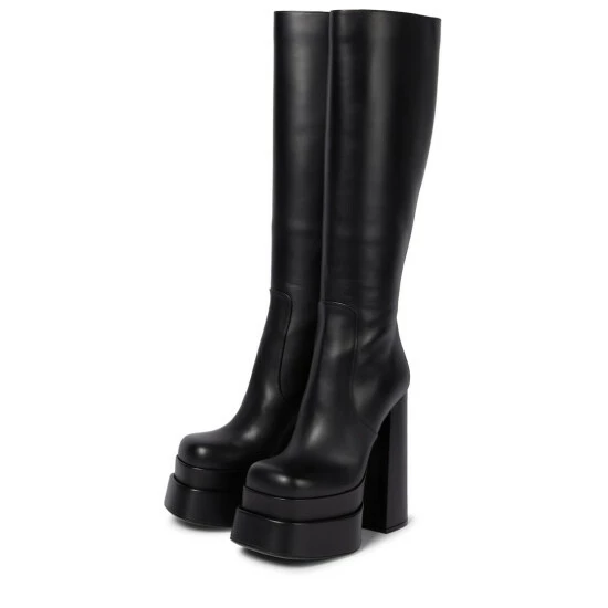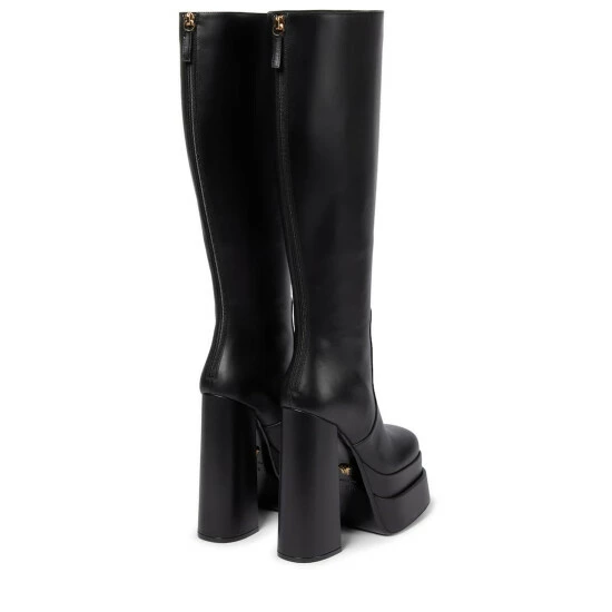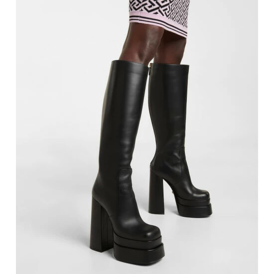 Make a statement in these knee-high boots from Versace. They’re made from soft black leather and set on double platform soles with equally towering block heels.