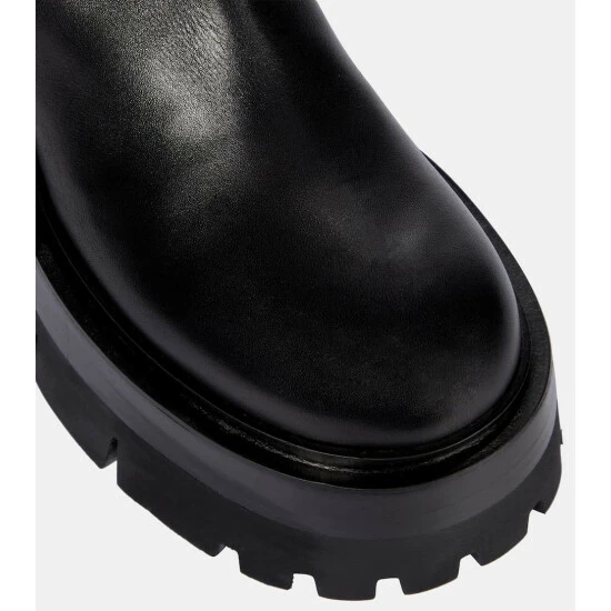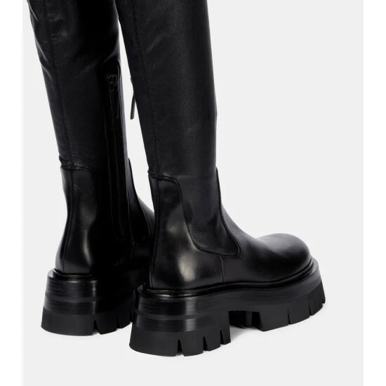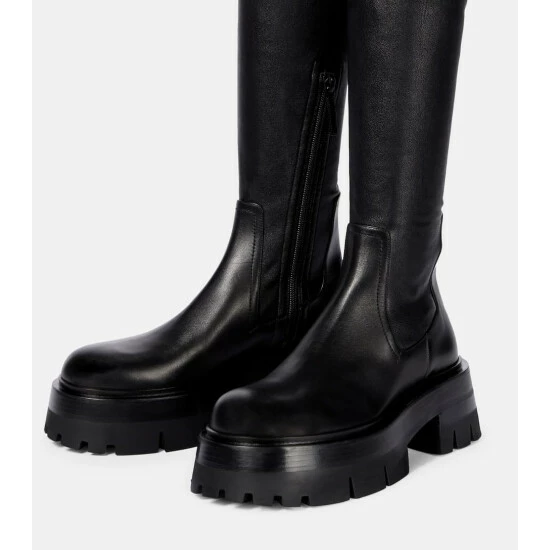 The Leonidis boots from Versace represent statement-making footwear. Made from polished black leather, the sock-like pair extend over the knees, and are set atop chunky cleated soles for proper traction.