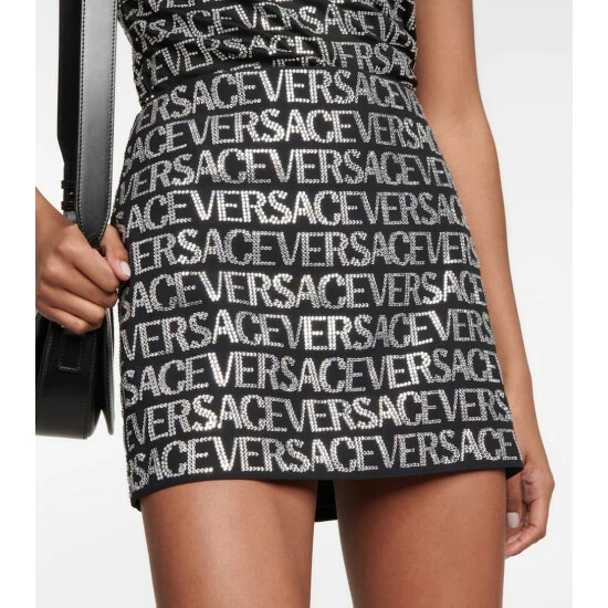 Sparkling crystals spell out a repeating logo motif on this Versace miniskirt. The snug-fitting style is designed to sit low on the hips.