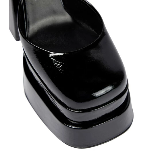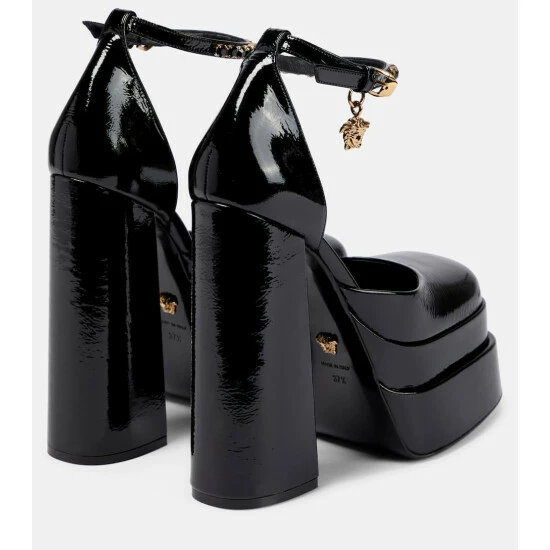 The Medusa Aevitas pumps from Versace are made from high-gloss patent leather in a striking square-toe silhouette. They feature tiered platform soles, block heels, and an embellished buckle ankle strap with a signature Medusa charm.