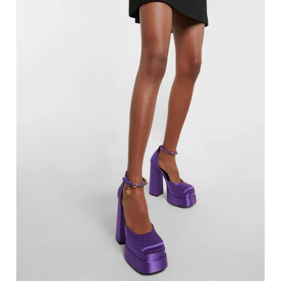 The Medusa Aevitas pumps from Versace are a lesson in statement glamour. They’re made from purple satin with towering double platform soles and slender ankle straps that are embellished with crystals and Medusa charms.