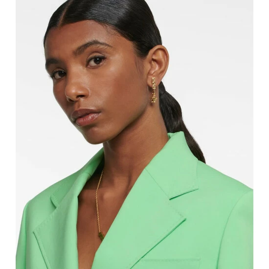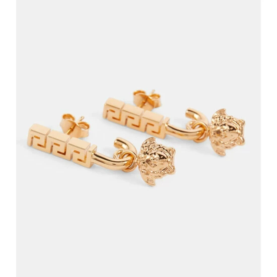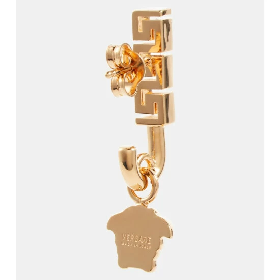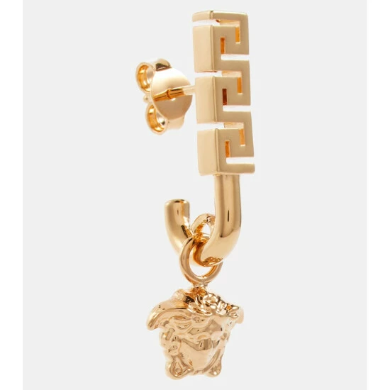 These Versace earrings are made in Italy from gleaming, gold-tone brass. Featuring both the Greca motif and tiny Medusa charms swinging from the hoops, this style showcases the house’s most iconic symbols.
