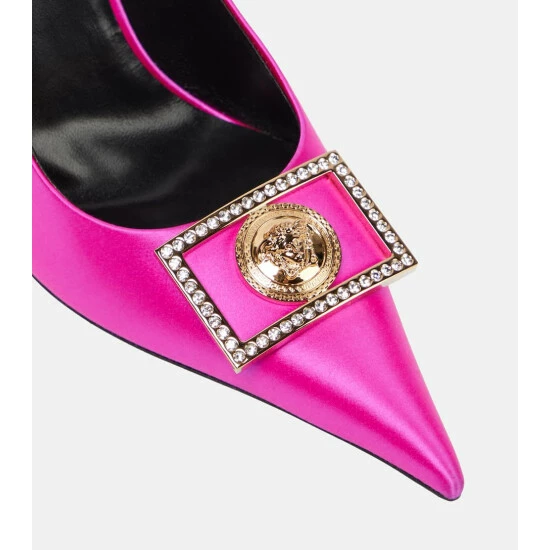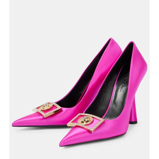 These Versace pumps are made in Italy from shiny hot pink satin and feature sharp, pointed toes, and elegant spool heels. The style is finished with gold-toned, crystal-embellished Medusa Biggie plaques.