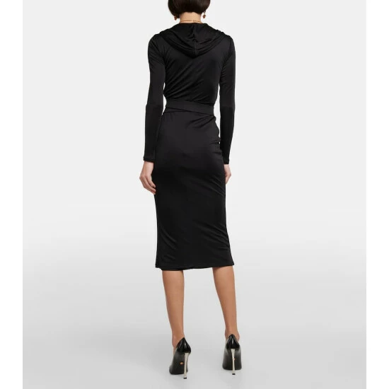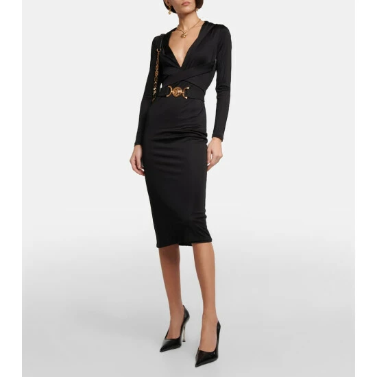 This black hooded midi dress from Versace is an LBD with a difference. The form-fitting piece has a plunging neckline and is defined by its crossover belt that displays iconic Medusa Biggie golden hardware.