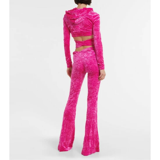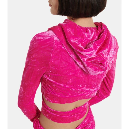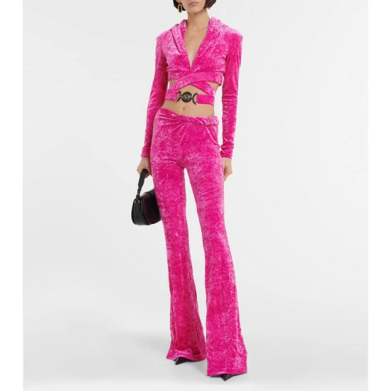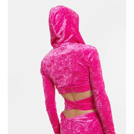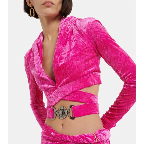 Embrace signature house codes in this cropped hoodie from Versace. Made from plush pink velvet, the design is defined by its Medusa Biggie embossed crossover belt and plunging neckline.