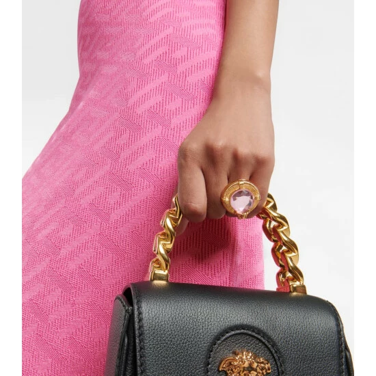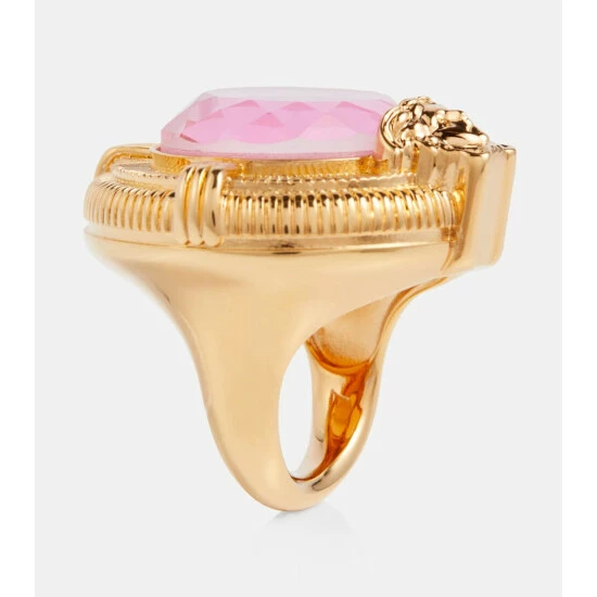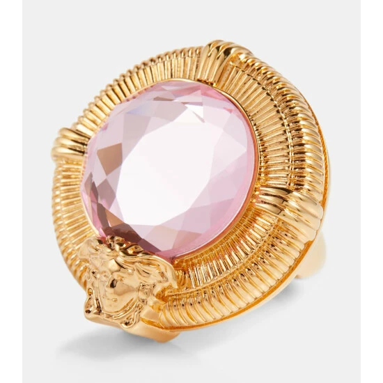 Stack this Medusa ring with other jewelry from Versace for a more-is-more look. It’s made in Italy from gold-toned metal with a large, faceted, light pink crystal at the center.
