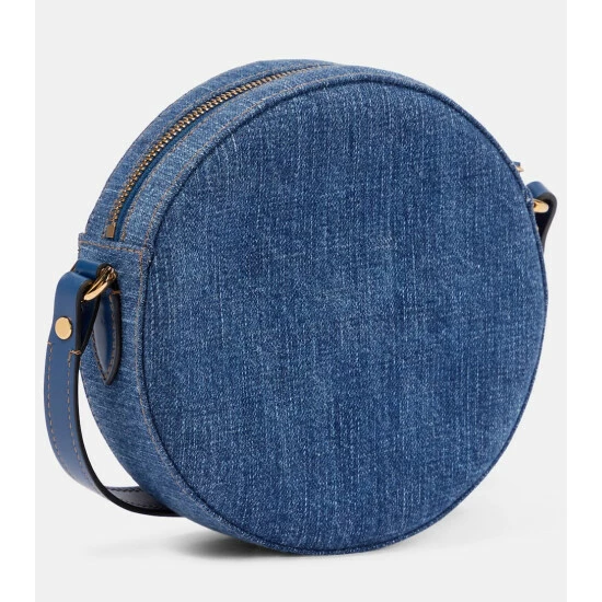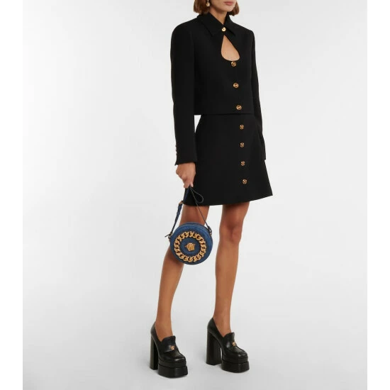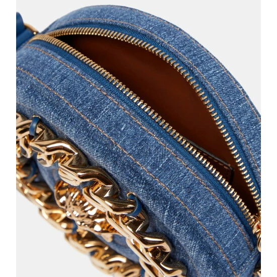 This denim bag from Versace proudly displays one of the most iconic emblems of the brand: the Medusa head. Inspired by ancient ruins, this golden embellishment is framed by an opulent chain.