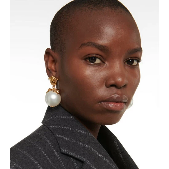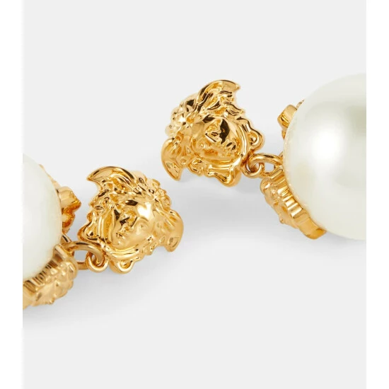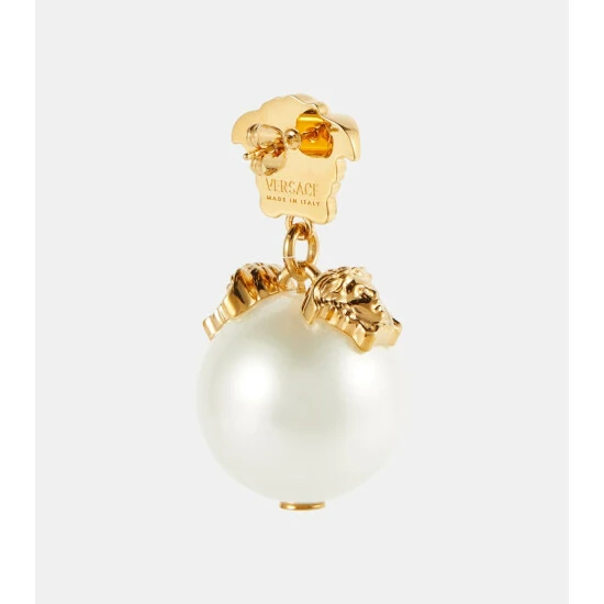 Versace’s range of jewelry adds opulence to evening looks. Detailed with the label’s Medusa motif, these earrings are defined by large drop faux pearls.