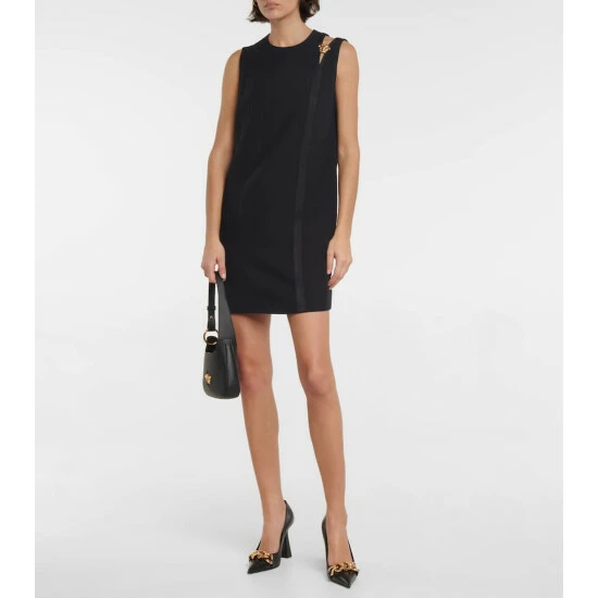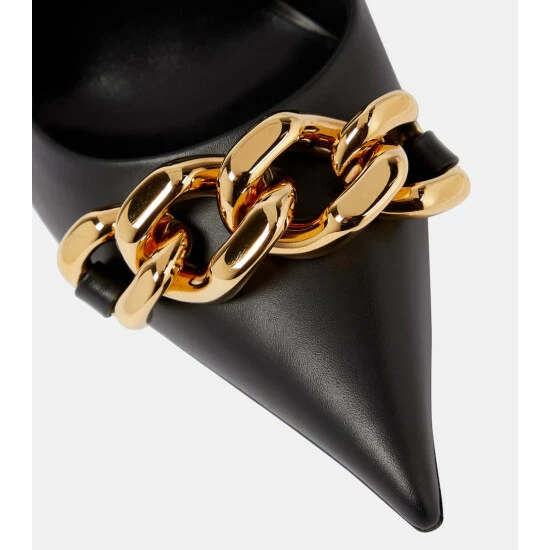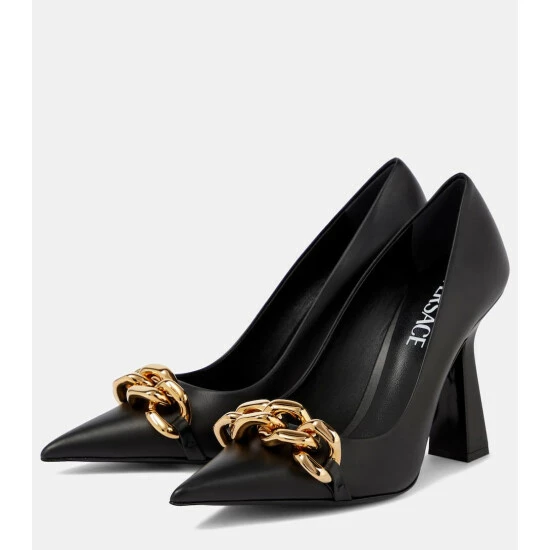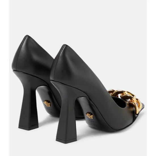 Versace’s spirited elegance will accompany you day and night with these leather pumps. Crafted in Italy, this black design has block heels and opulent gold chains that capture the light at every step.
