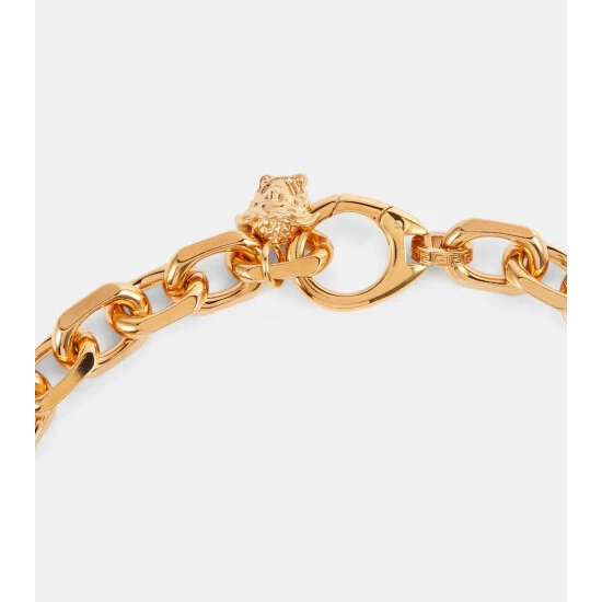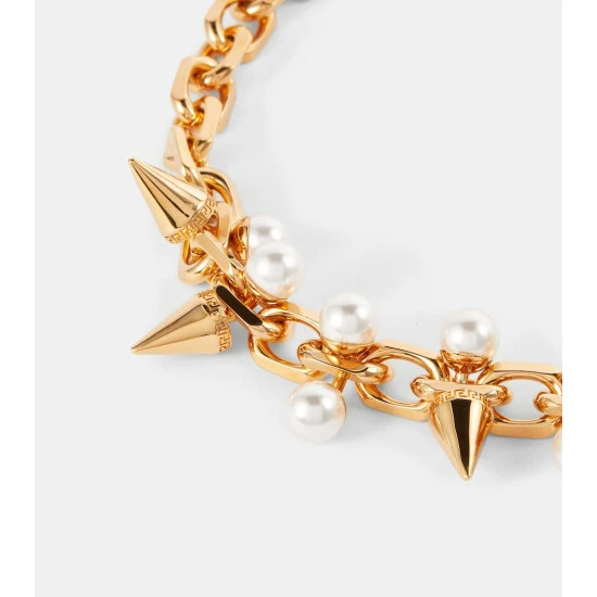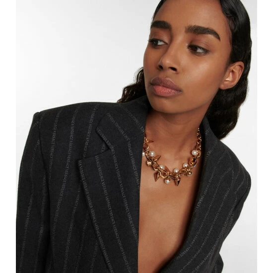 Inspired by Greek mythology, the Medusa head has become the ultimate signifier of the house of Versace. This gold-tone chunky chain necklace is adorned with Medusa hardware, faux pearls, and Greca engraving on the spikes.