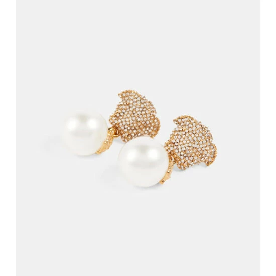 Carry the spirit of Versace with you at all times with these faux pearl earrings. The design is topped with the golden Medusa head, a brand signature inspired by the childhoods of Gianni and Donnatella Versace.