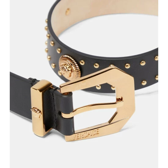 Complete your everyday ensembles on a glamorous note with this belt from Versace. Made from supple leather, the studded style features Medusa Heritage fittings with a golden embossed buckle.