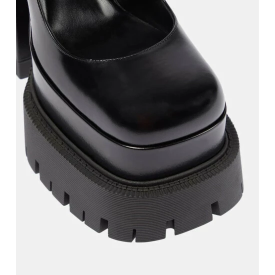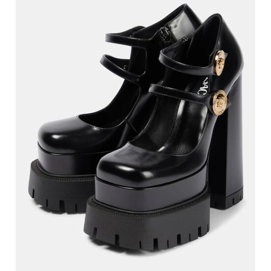 Step onto the scene in these bold platform pumps by Versace. Made from polished leather in Italy, this Mary Jane style has dramatic lugged soles, square toes, and Medusa coin hardware to the dual straps.