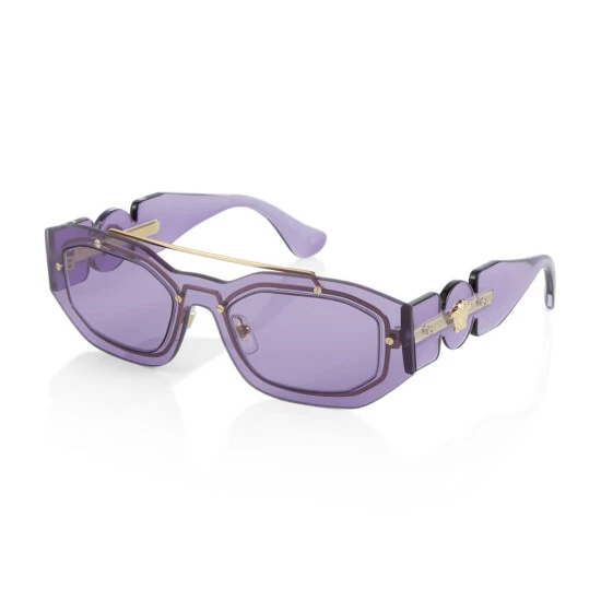 Subtle they are not, but stylish they certainly are – these Versace sunglasses are made with rectangular, transparent frames with matching, tonal lenses. In purple, they feature gold-toned hardware and brand-iconic Medusa plaques.