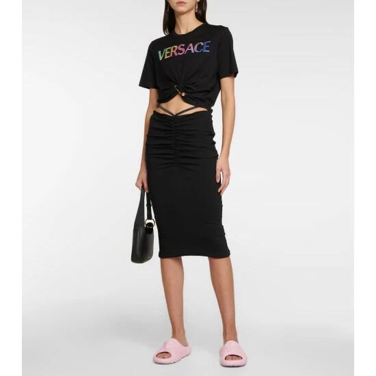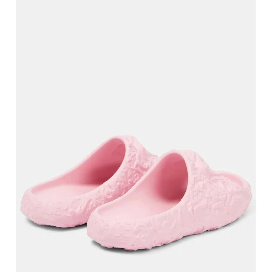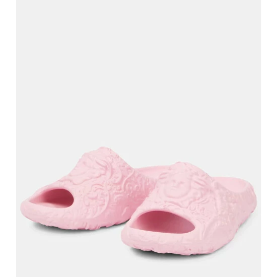 These sculptural slides from Versace showcase a carved Medusa head and Barocco motif. Made from rubber, they have molded footbeds.